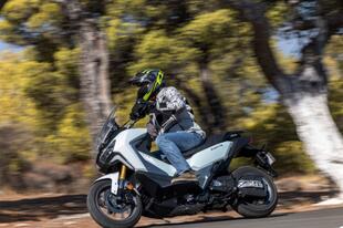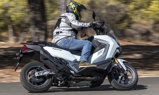 Questo maxiscooter sfoggia soluzioni tecniche raffinate ed è in grado di affrontare anche gli sterrati. In movimento non è un fulmine nell’impostare le curve, ma l’avantreno è sempre preciso. Il motore è montato in mezzo alla pedana per avere la migliore distribuzione dei pesi, le sospensioni vedono al lavoro una forcella a steli rovesciati da 41 mm e un monoammortizzatore collegato al forcellone in alluminio tramite leveraggi progressivi. L’impianto frenante può contare su un disco anteriore da 275 mm con pinza ad attacco radiale e uno posteriore da 233 mm, l’anteriore però va strizzato con decisione. L’elettronica prevede ABS e controllo di trazione disinseribili (l’ABS solo al posteriore). La dotazione comprende poi parabrezza regolabile manualmente, paramani, manubrio in alluminio a vista, accensione con telecomando keyless e presa USB nel retroscudo. La posizione di guida è rialzata e dà subito confidenza. Il grosso tunnel centrale però toglie spazio ai piedi, mentre il retroscudo sporgente sfiora le ginocchia del pilota. Il motore è grintoso, solo superati i 120 km/h la spinta diminuisce un po’ e si sentono vibrazioni sulle pedane (non fastidiose).
