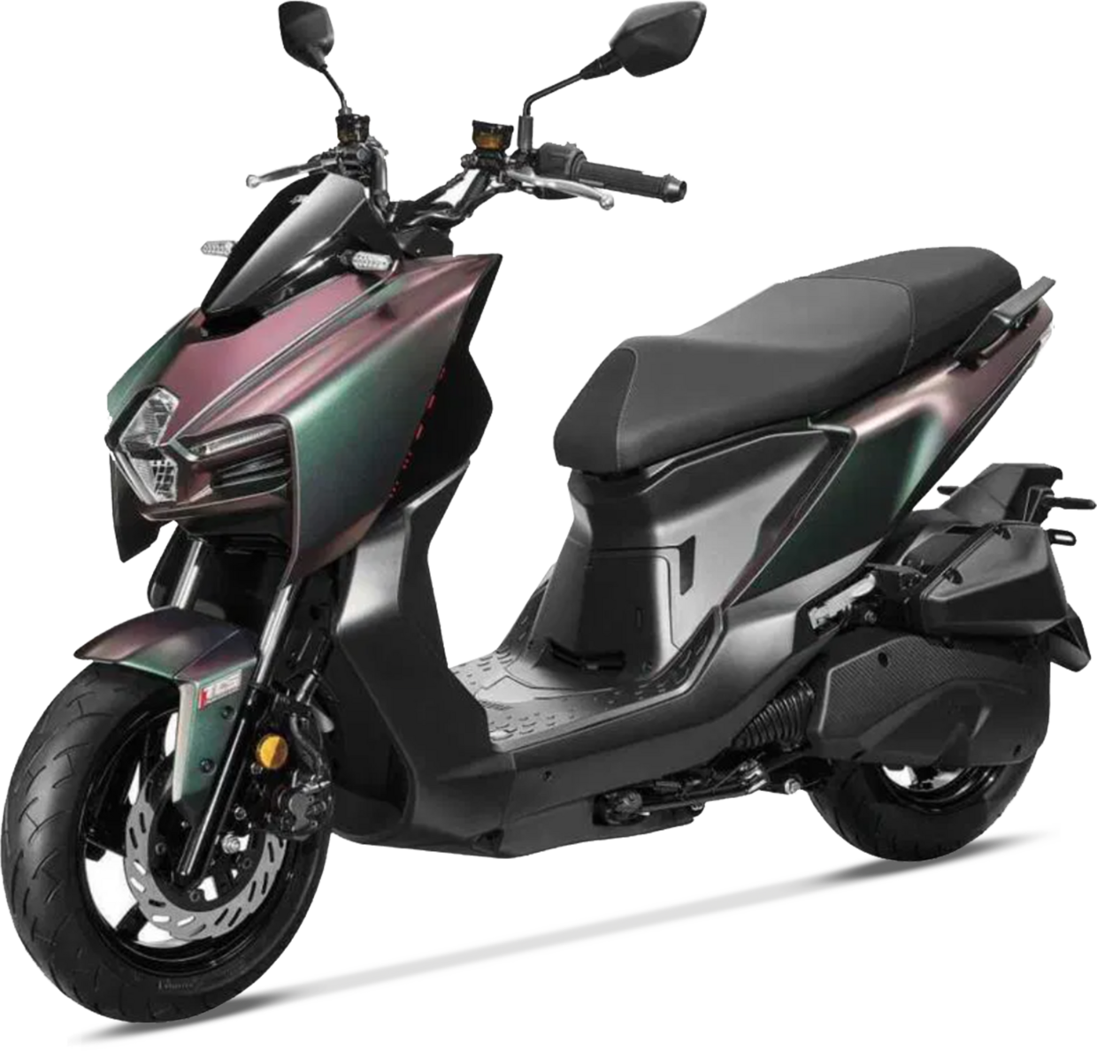 Il design è originale, la verniciatura della carrozzeria cambia colore in base alla luce e la finitura delle plastiche è ispirata alla pelle dei serpenti, con questo SYM non si passa certo inosservati! Anche il nome MMBCU, quasi impronunciabile, è particolare: unisce infatti la sigla CU (Crossover Unico) a MMB che sta per “Mamba”, il serpente più velenoso dell’Africa. Meglio chiamarlo semplicemente Mamba! La ciclistica vede al lavoro una forcella tradizionale e un monoammortizzatore collegato a un sistema che migliora la stabilità in accelerazione. La dotazione di serie comprende il controllo di trazione, il sistema Start & Stop e nel retroscudo una presa USB per il cellulare. Comoda l’ampia pedana piatta che permette di caricare uno zaino, mentre nel sottosella ci sta un casco jet e avanza spazio per un antipioggia. Lo scudo protegge poco le gambe e anche busto e casco restano completamente esposti. Le sospensioni sono confortevoli, i cerchi da 13” e le dimensioni compatte, lo rendono molto agile nel traffico e piacevole da guidare. Il motore accelera forte, grazie anche alla trasmissione a punto e permette di raggiungere in fretta la velocità.