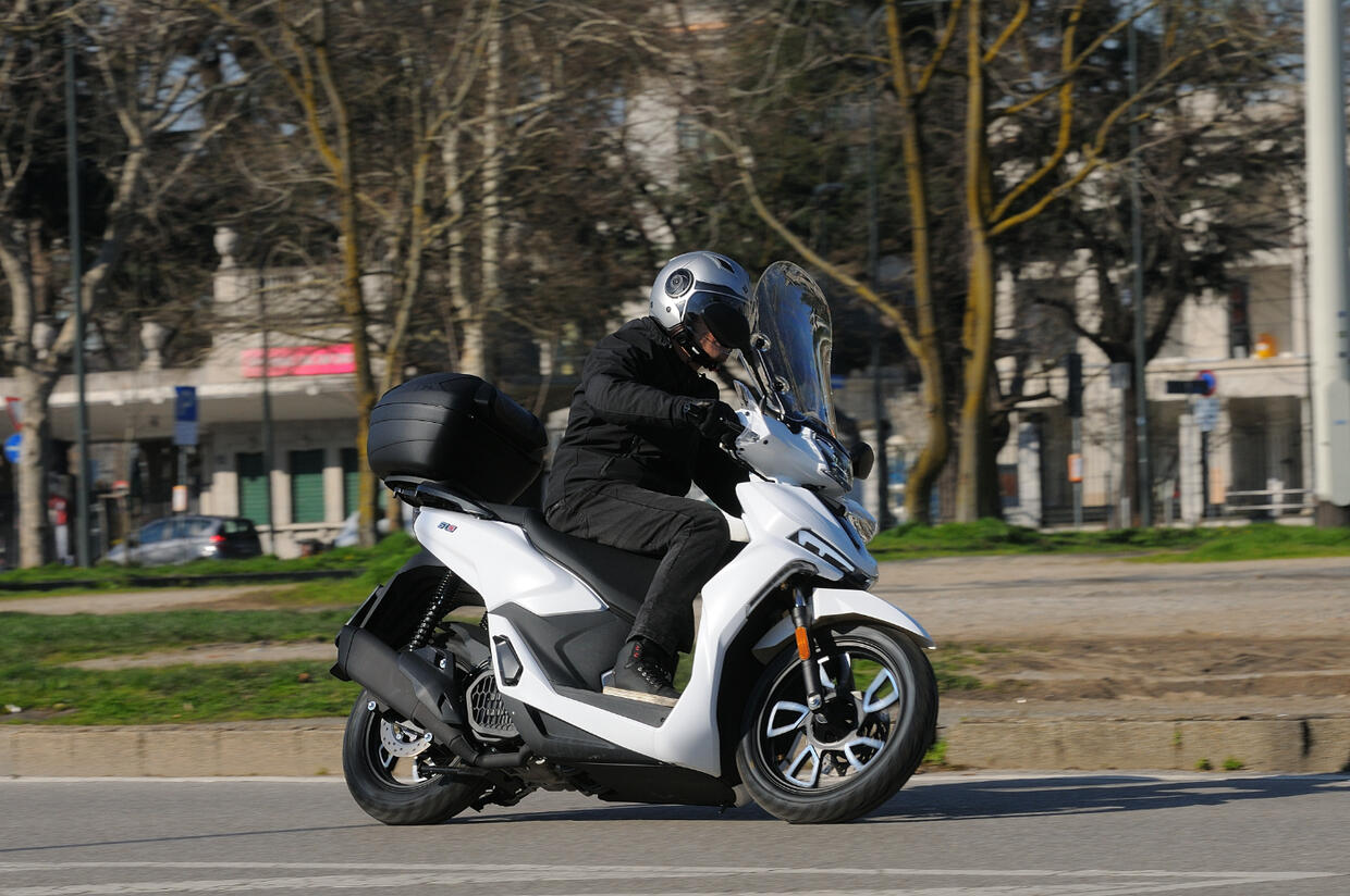 È uno scooter a ruote alte di qualità con una dotazione di serie ricca, di serie ci sono: ABS, controllo di trazione, smartkey, display digitale con navigatore e telecamera frontale che registra le immagini in caso di incidente. La capacità di carico è buona: ha la pedana piatta e un vano sottosella che ospita un casco integrale, lasciando spazio per altri oggetti. Nel retroscudo invece ci sono il gancio portaborse e un portaoggetti con presa USB. Completano la dotazione parabrezza, paramani e bauletto da 34 litri in tinta. La posizione di guida è comoda e il motore accelera bene, grazie alla trasmissione ben accordata. La frenata è modulabile ma bisogna tirare con forza le leve. Rigide le sospensioni.
