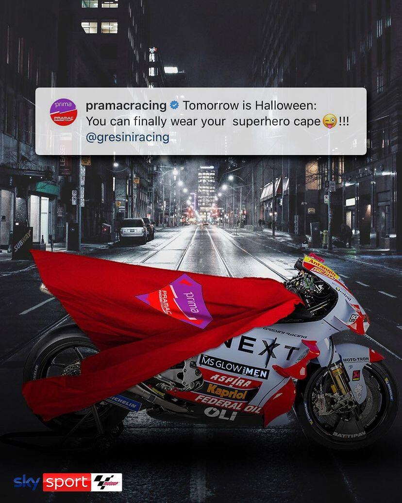 Halloween è alle porte e il team Pramac ha deciso di festeggiarlo con un simpatico siparietto, “prendendo di mira i "cugini" del team Gresini: la squadra satellite Ducati ha infatti postato una moto speciale, con la livrea tipica dei mezzi guidati da Enea Bastianini e Fabio Di Giannantonio e un mantello rosso griffato Pramac: "Gresini Racing, finalmente potete indossare il mantello da supereroe", il messaggio social di Pramac. "Che moto!", la risposta con tanto di cuoricino e un commento sul fatto che la livrea metta bene in rilievo sponsor importanti. Come a dire: grazie che ci fate pubblicità.