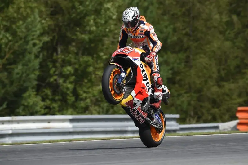 La decima pole position stagionale è stata conquistata da Marc Marquez che sul circuito di Brno, pista dove in luglio Honda aveva svolto due giorni di test privati, ha fermato il cronometro sull’1’54.981 e domani scatterà così dalla prima posizione della griglia di partenza. La lotta al pole position è stata incandescente e Valentino Rossi è stato il secondo più veloce in pista, fermandosi a soli 39 millesimi dal portacolori Honda. La prima fila sarà chiusa da Dani Pedrosa, che paga solo + 0.138 dal suo compagno di squadra, mentre ad aprire la seconda domani troveremo Andrea Dovizioso, che non ha mai davvero lottato per la prima posizione ed è infatti staccato da Marquez da oltre quattro decimi. Buone qualifiche anche per il suo compagno di squadra Jorge Lorenzo, che ha concluso sesto, mentre tra le due Ducati Desmosedici GP ha chiuso Cal Crutchlow, che dopo la caduta nelle FP3 ha una sospetta frattura alla vertebra T6. Scatterà dalla terza fila Maverick Vinales, che non riesce a ritrovare lo stesso feeling con la Yamaha M1 dimostrato nelle prime gare stagionali. Alle sue spalle c’è Danilo Petrucci, che dopo aver superato il primo turno di qualifiche ha ottenuto l’ottavo miglior crono a sette decimi e mezzo di ritardo da Marquez. Nono tempo, invece, per Alvaro Bautista, seguito da Johann Zarco e da Aleix Espargaro, che dopo i buoni risultati nelle prove libere è scivolato nelle fasi finali del turno. Dodicesimo infine Loris Baz.