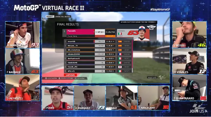 MotoGP news – La seconda gara virtuale della stagione è stata vinta da Francesco Bagnaia, che con la sua Ducati Desmosedici GP20 ha duellato fino all'ultimo con Maverick Vinales, firmando il successo per una manciata di millesimi. Terzo Alex Marquez, che ha battuto il fratello Marc, mentre Valentino Rossi, alla sua prima gara online, ha chiuso settimo