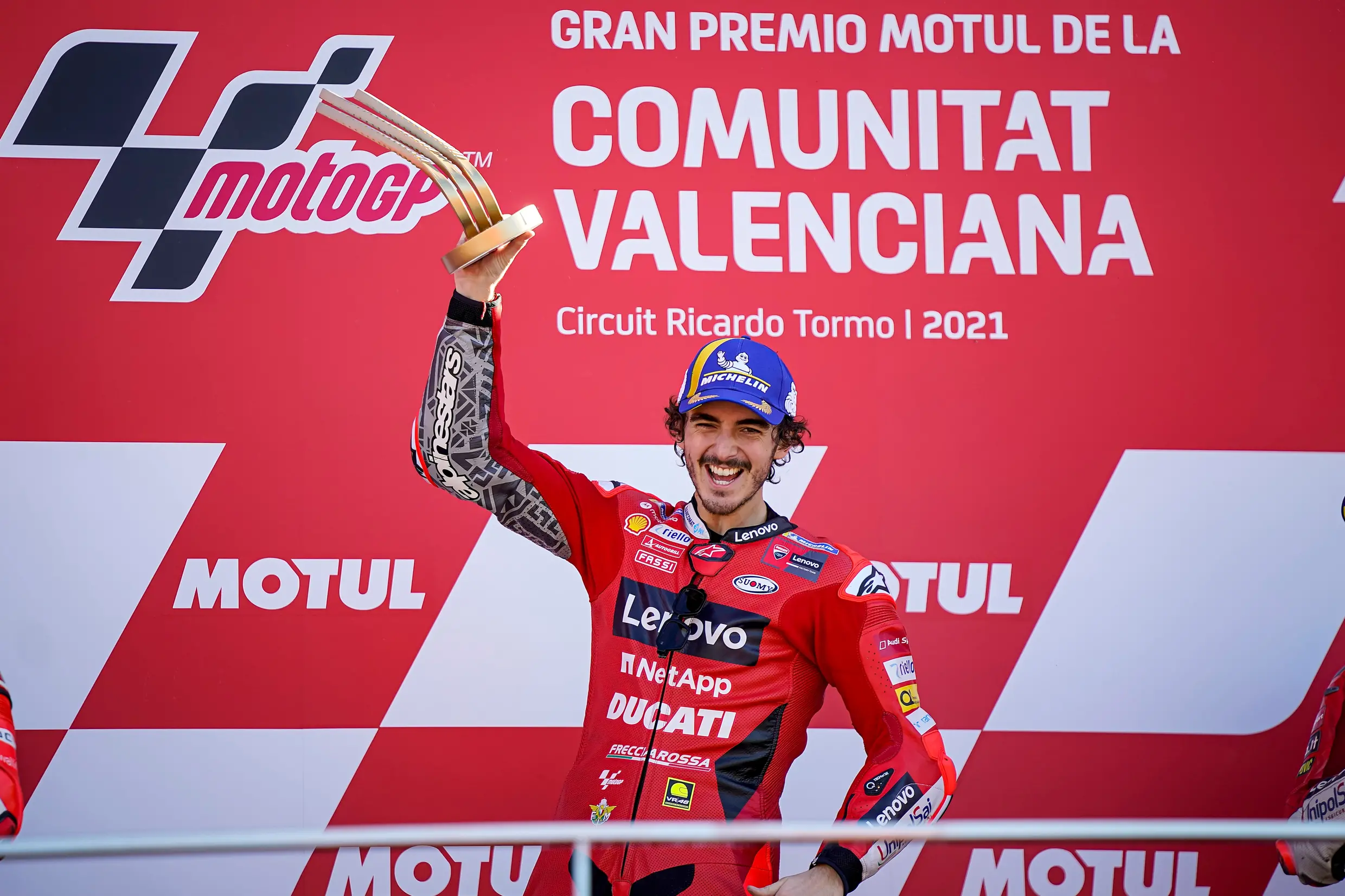 L’ultimo Gran Premio della stagione, andato in scena a Valencia, si è concluso con un risultato storico per Ducati, che ha piazzato tre piloti sul podio. La vittoria di Pecco Bagnaia, davanti al debuttante Jorge Martin e al compagno di squadra Jack Miller, ha permesso al team di conquistare il titolo di miglior squadra 2021.