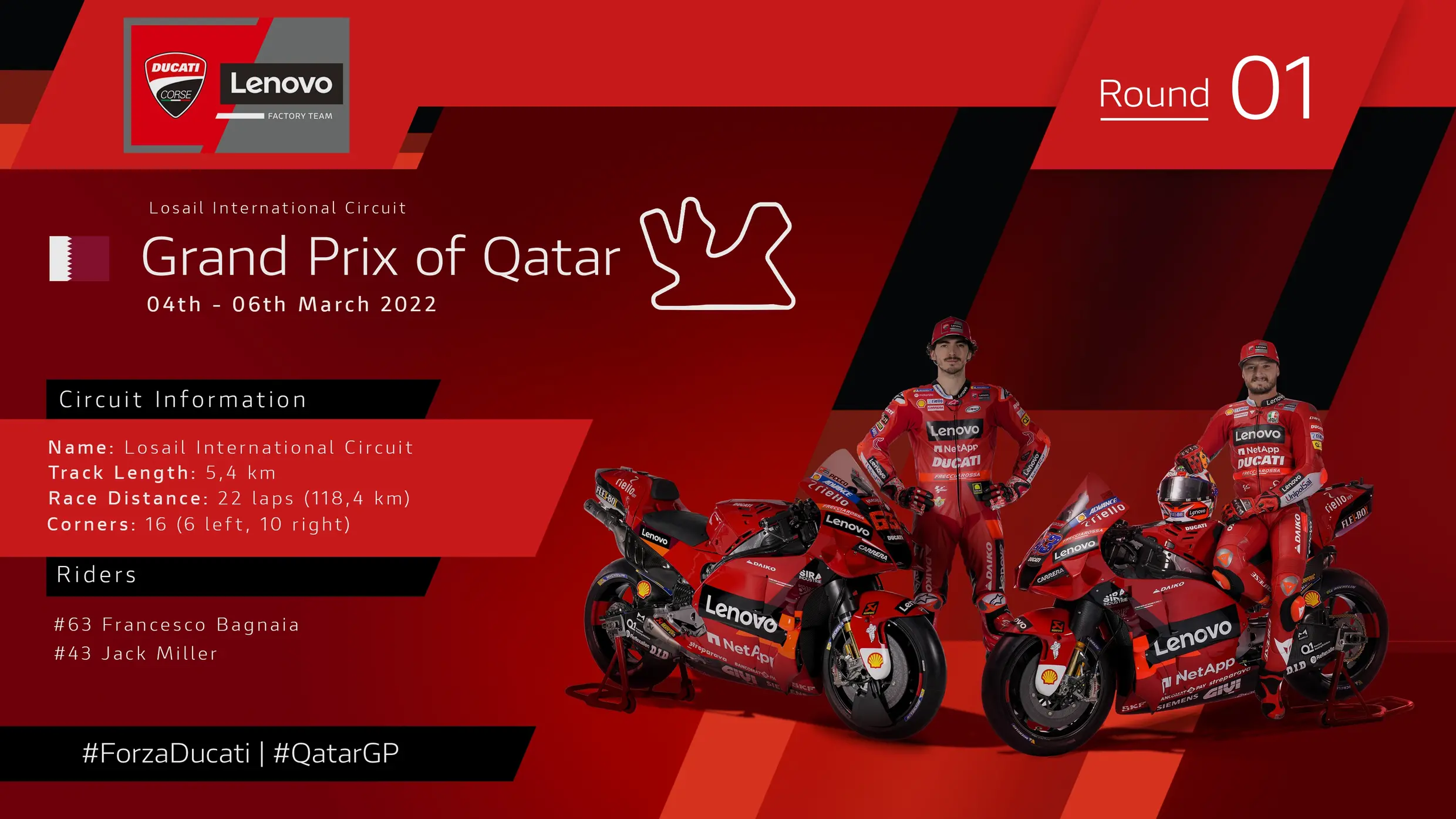MotoGP news - La nuova stagione parte come da tradizione dal circuito di Losail, in Qatar, e Ducati qui in passato ha ottenuto grandi risultati, come 15 podi e 5 vittorie. Francesco Bagnaia e Jack Miller sono pronti ad aumentare questi numeri, per iniziare al meglio il nuovo campionato