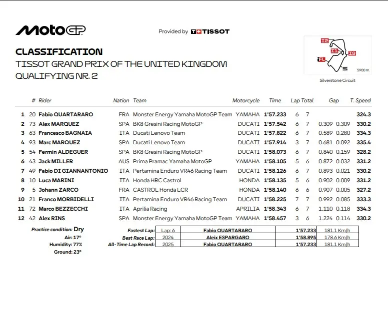 Il francese della Yamaha firma la pole position anche nel GP di Gran Bretagna, precedendo Álex Márquez e Francesco Bagnaia.