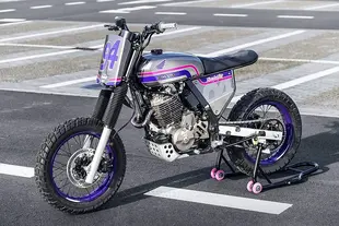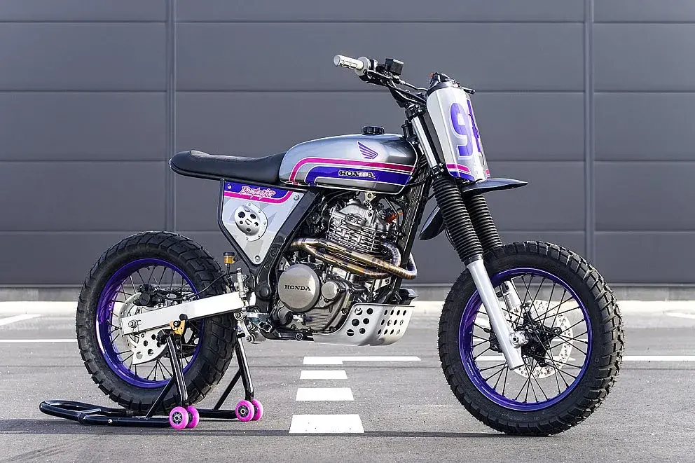 I fratelli Jarek e Aleksander Turkosz di Adrenaliner Design in Polonia hanno voluto rendere omaggio agli anni '90, quando la Dominator si presentava con grafiche sgargianti in turchese, viola e rosa. Il loro obiettivo era chiaro: una moto da strada con anima flat tracker e supermoto, ma con lo spirito colorato di quegli anni. Hanno montato cerchi da 17 pollici, trovato un serbatoio da Honda CB350 del 1970 e costruito un telaio posteriore completamente nuovo. Ma il pezzo forte è il sistema di fari a scomparsa: quando la moto è spenta, una piastra copre i fari; all'accensione, un meccanismo con servomotore e interruttori di finecorsa fa aprire la copertura in un movimento complesso che prima arretra e poi si sposta lateralmente. Un'idea totalmente inutile, ma ad alto impatto estetico.