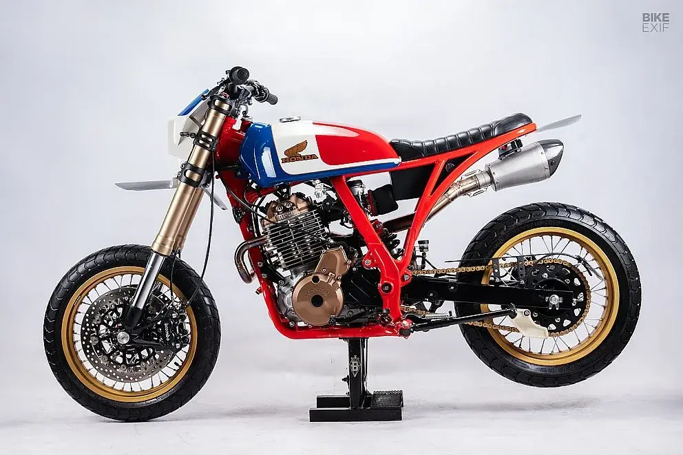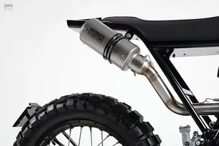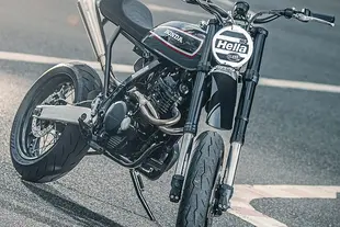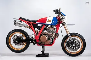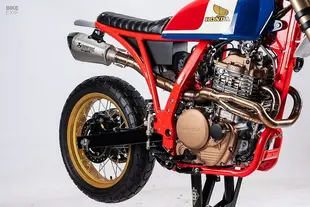 Marcelo Obarrio e Germán Karp di STG Tracker con sede a Buenos Aires hanno preso una Dominator del 1989 ridotta malissimo e l'hanno trasformata in un gioiello con livrea HRC classica. Dopo aver ricostruito completamente il motore, hanno innestato una forcelle rovesciata e le pinze freno Brembo di una Ducati Multistrada 1200, ricostruendo da zero la zona anteriore. Il telaio posteriore è stato accorciato e ricostruito, con un ingegnoso sistema sotto la coda che ospita LED per frecce e fanale, elettronica, scarico e regolatore di tensione, il tutto incastrato alla perfezione. Lo scarico due-in-uno in acciaio inox sfrutta le due uscite del monocilindrico Dominator - una peculiarità della moto - e termina in un silenziatore Akrapovič mutuato da una BMW.
