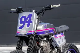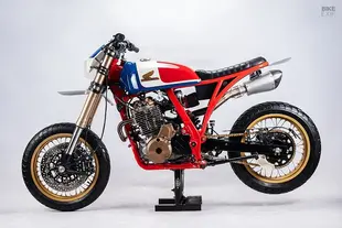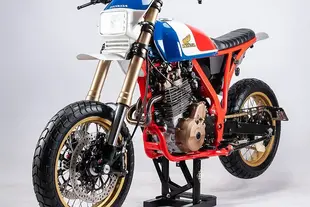 Massimo Rinchiuso di Fuchs Workshop con sede a Ravenna ha costruito questa Dominator per l'amico Niko Sorbo, tre volte campione francese di flat track. La moto, soprannominata Rusinella come la madre di Niko, è una moto da gara fatta e finita. Il forcellone viene da una Honda CRF450, scelto per la rigidità e la leggerezza, accoppiato a un ammortizzatore regolabile. Il motore è dotato di un pistone maggiorato, testa rielaborata con condotti rifiniti, albero motore e volano alleggeriti, albero a camme riprogettato e un carburatore aggiornato con filtro dell'aria maggiorato. All'anteriore, forcella da 41 mm presa da una CBR e montata su piastre di sterzo lavorate al CNC, con l'inclinazione dello sterzo modificata a 25 gradi per renderla più reattiva in curva. La livrea mescola i colori Honda classici con l'alluminio a vista del serbatoio e il telaio blu. Ruote oro e motore nero le danno un aspetto da moto da corsa ufficiale.