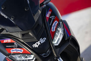 La colorazione nero opaco di Aprilia SR GT Replica è arricchita dalle stesse grafiche rosse e viola che caratterizzano le carene della RS-GP del team ufficiale Aprilia Racing, e dal caratteristico grande logo che percorre diagonalmente fiancate e tunnel centrale, per concludersi sulla parte anteriore della pedana. Anche quest’ultima, così come il maniglione passeggero, è rifinita in nero opaco. Esattamente come sulle MotoGP, anche i cerchi ruota sono verniciati in nero, con dettaglio rosso a contrasto sul canale del cerchio anteriore. Vera “chicca” i dischi freno anteriore e posteriore con profilo a margherita. In linea con l’anima racing, l’allestimento prevede inoltre pneumatici con battistrada stradale dal disegno sportivo al posto degli “all terrain” lievemente tassellati che caratterizzano le altre versioni. Infine i loghi degli sponsor del team Aprilia Racing, che rendono la livrea di Aprilia SR GT Replica 2025 ancora più fedele a quella delle RS-GP, mentre a corredo sono forniti anche i numeri di gara dei due piloti ufficiali, cioè il Campione del Mondo Jorge Martin e Marco Bezzecchi.