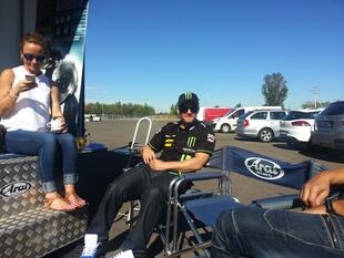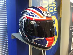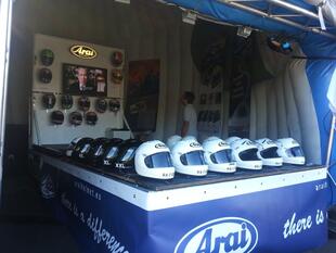 A sx, il pilota inglese Cal Crutchlow e a destra l'Arai Racing Service per il check-up gratuito del casco.