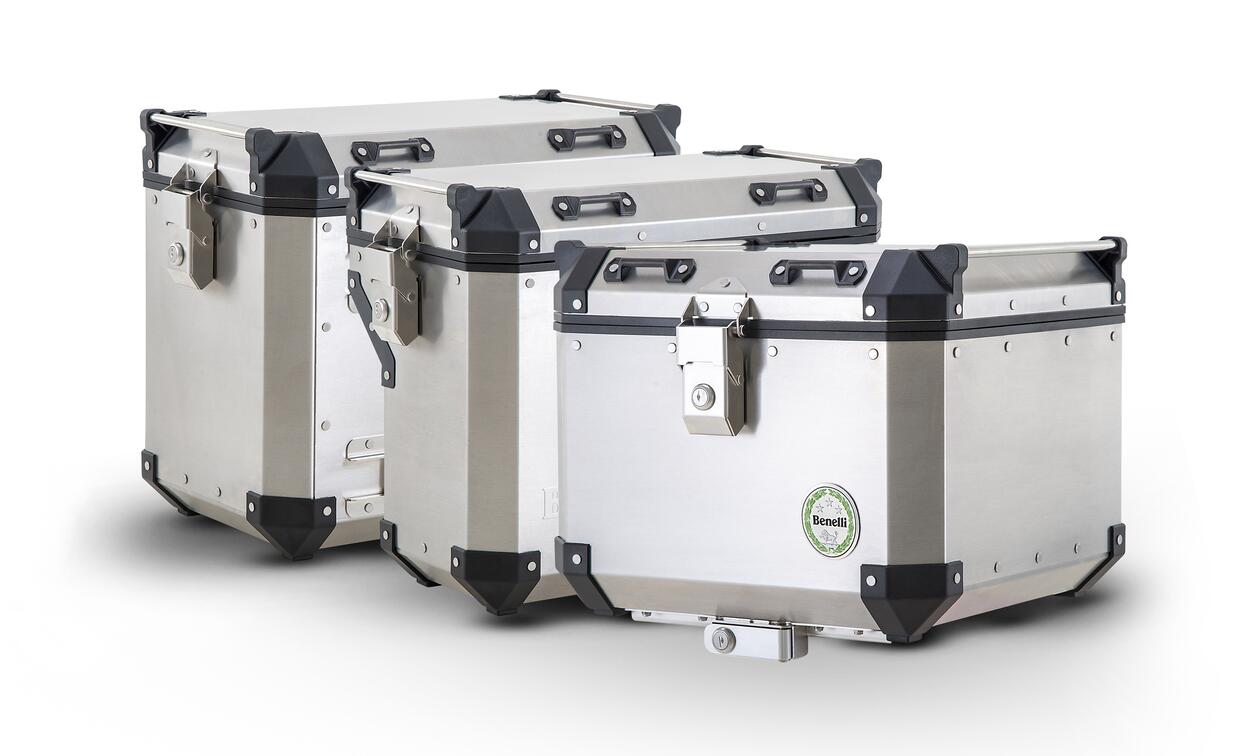 Per le TRK 502 e TRK 502 X è stata realizzata una coppia di valigie laterali in alluminio compatibili con tutte le versioni, comprensive dei telaietti per il fissaggio alla moto; la valigia di sinistra ha una capacità di 42 litri e quello di destra di 36, il set completo costa 599 euro. Volendo si può aggiungere anche il top case in alluminio con logo Benelli, ha una capacità di 46 litri e anche questo è completo di piastre di fissaggio; Costa 319 euro, ma acquistando il set completo di tre borse il prezzo totale scende a 859 euro.
