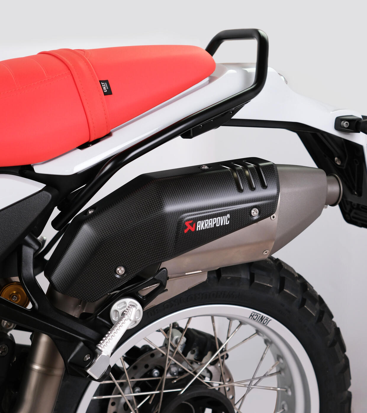Il kit Paris Dakar include un serbatoio da 25 litri omologato, verniciato e pronto al montaggio, un nuovo cupolino e un parafango posteriore dedicato. La ciclistica viene migliorata con sospensioni pluriregolabili di tipo racing: al posteriore un monoammortizzatore, all’anteriore una forcella con steli trattati TIN e piedini lavorati CNC. Le ruote sono pensate per l’off-road più impegnativo, con cerchi ad alta resistenza, mozzi alleggeriti, raggi centrali e dischi freno alleggeriti. Il sistema di scarico, sviluppato in collaborazione con Akrapovic, prevede terminale alto in titanio con paracalore in fibra di carbonio e collettore privo di catalizzatore.