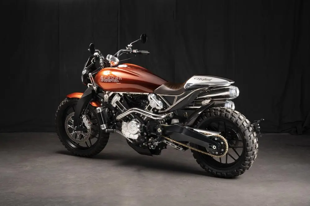 Il nuovo modello della Brough Superior è stato allestito sulla base tecnica della SS100 e ne condivide le parti più importanti, ma strizza l’occhio al fuoristrada leggero, per cui gli scarichi sono sovrapposti sul fianco destro e gli pneumatici tassellati