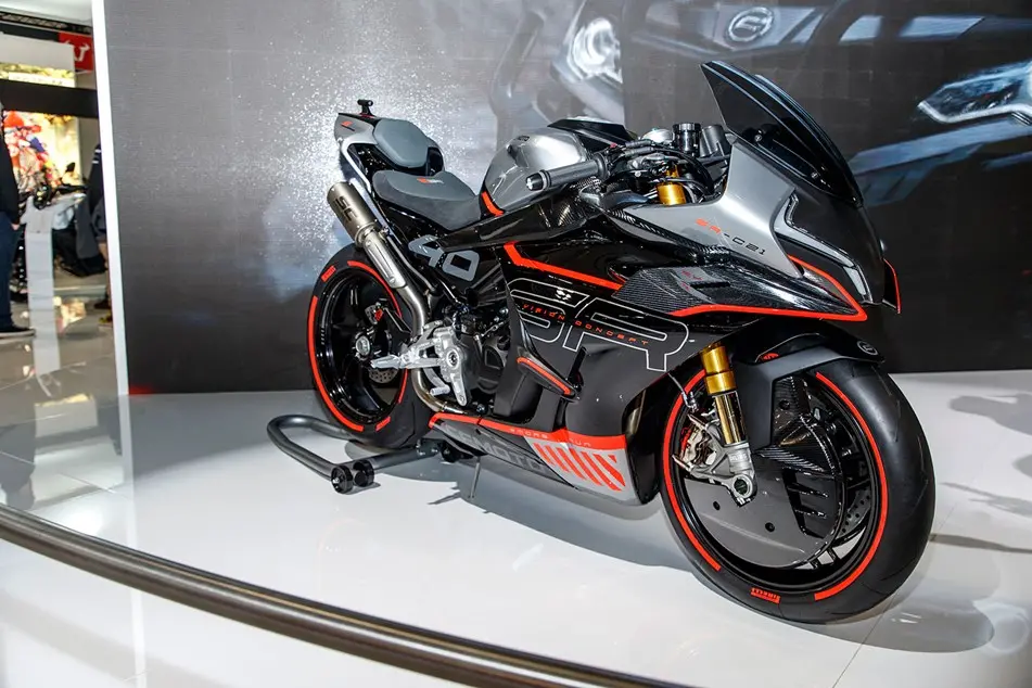 Al Salone di Milano dello scorso anno CFMoto aveva presentato un concept carenato molto intrigante denominato SR-C21, dove “C” sta per “Concept” e ”21” è l’anno in cui il prototipo è stato svelato. I cinesi avevano dichiarato che sarebbe stato messo in produzione l’anno successivo ed hanno mantenuto la promessa. La versione definitiva si chiama 450SR e mantiene la filosofia della SR-C21, anche se la componentistica ora è più vicina al mondo reale, cioè essenzialmente è meno costosa. In particolare gli enormi dischi freno anteriori Brembo hanno lasciato il posto a un disco solo, sempre con pinza Brembo ma senza carter di copertura, la spettacolare forcella Öhlins è stata sostituita da una unità a steli rovesciati di 37 mm Ø più leggera e più semplice, e al posto del bellissimo forcellone monobraccio ne è stato adottato uno più convenzionale, a due bracci.