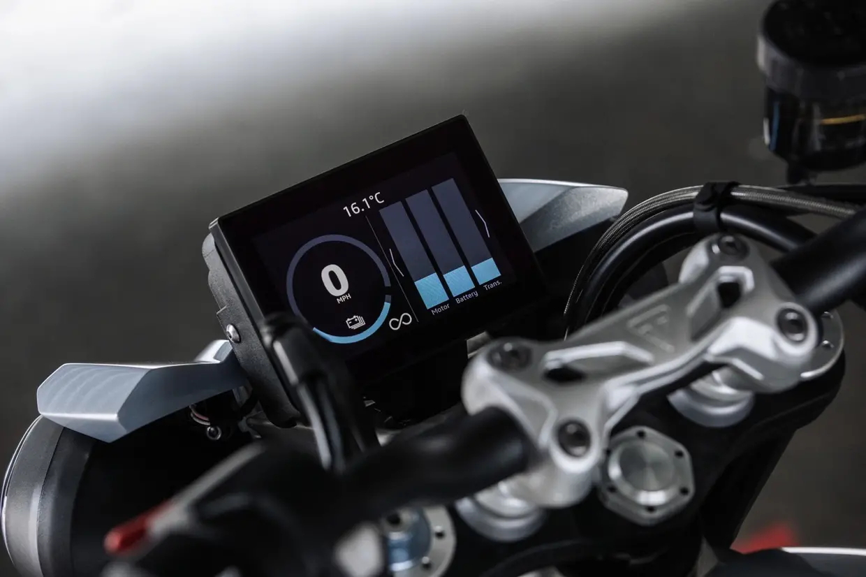 La Triumph TE-1 pesa anche relativamente poco, per essere una moto elettrica: 220 kg, con dimensioni e dinamiche di guida paragonabili a quelle di una Street Triple ma con l’ergonomia, la geometria e la distribuzione del peso di una Speed Triple.