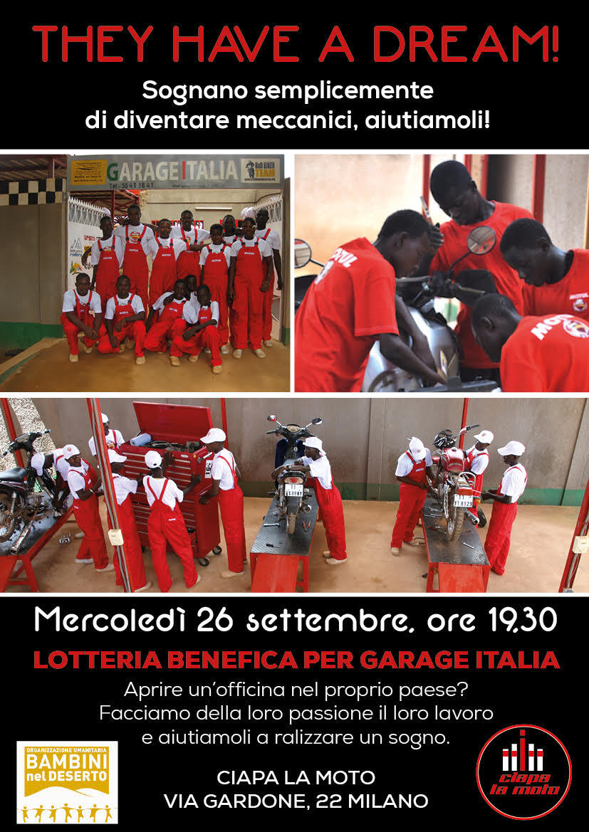 Torna l’ormai tradizionale evento benefico ospitato dagli spazi milanese di Ciapa la Moto: protagonista della lotteria annuale sarà questa volta (lo scorso anno è toccata ai ragazzi delle Fiabe dei Motociclisti) il progetto della ONLUS Bambini nel Deserto “progetto Garage Italia”, scelto per il 2018 come come destinatario della raccolta fondi. Attiva dal 2000 Bambini nel Deserto Onlus ha un obiettivo: migliorare le condizioni di vita delle comunità africane per garantire loro un vita dignitosa nel loro paese. Questo è stato fatto attraverso il completamento di oltre 450 progetti in 11 Paesi africani in tutti i settori della Cooperazione Internazionale. Fra le attività più innovative rientra anche il progetto Garage Italia, una scuola di formazione in meccanica (riparazione di motociclette) a Ouagadougou (Burkina Faso – AfricaOccidentale). Dal 2014, anche grazie al contributo economico della Fondazione Motul Corazón, Garage Italia ospita ogni anno circa 10 ragazzi da formare. La struttura che ospita la scuola è una vera e propria officina dove i ragazzi, oltre a seguire lezioni pratiche, possono riparare le motociclette dei clienti oltre a seguire corsi di alfabetizzazione e informatica di base. Il 75% di coloro che completano il corso trova lavoro in un Paese dove il tasso di disoccupazione è tra i più alti al mondo: l’obiettivo è infatti quello di fornire una chance ai ragazzi per continuare a vivere nel loro Paese creando così un solido futuro in alternativa a una scelta migratoria verso l'Europa.
