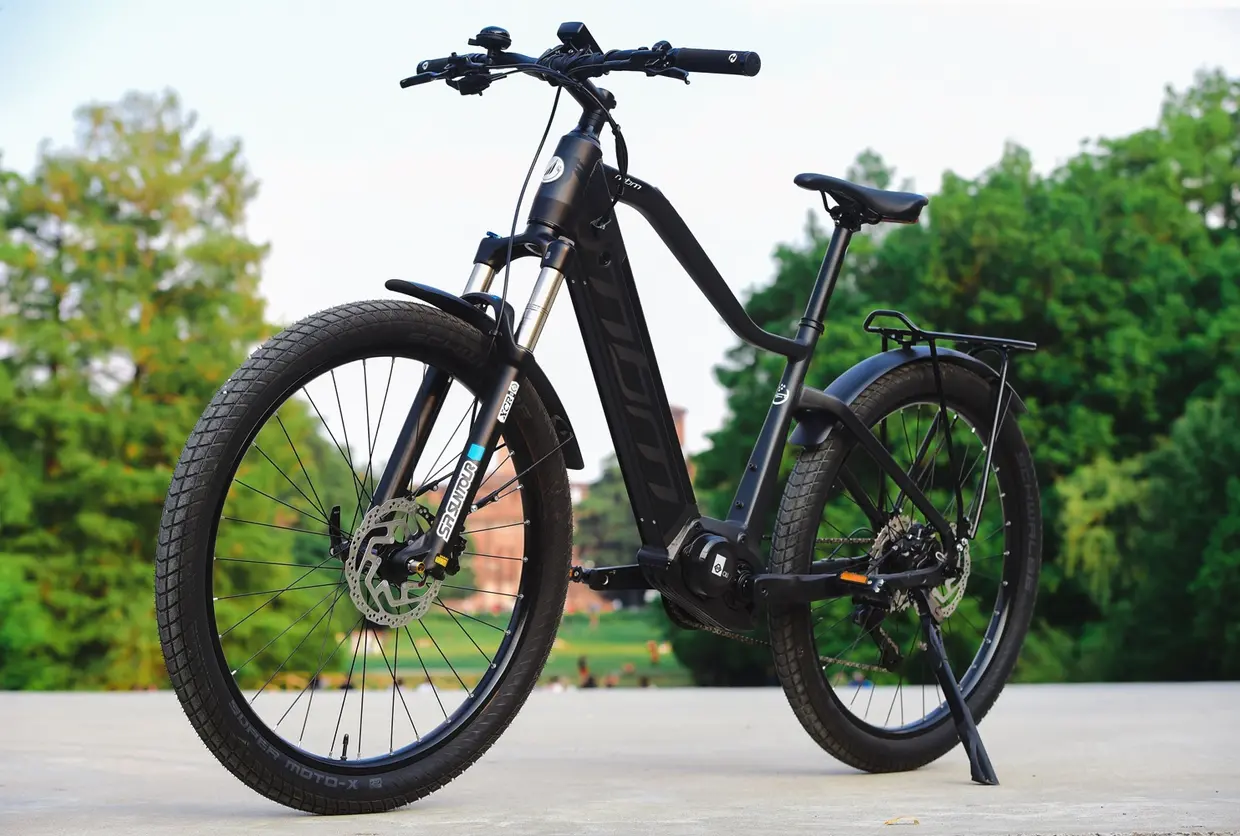 Questa Trekking e-bike, grazie ai suoi “ruotoni” da 2,8” di sezione e alla robusta forcella con 110 mm di escursione, va bene per l’uso urbano e per le gite fuoriporta del fine settimana. È equipaggiata col motore della Oli Sport che eroga una coppia di ben 85 Nm