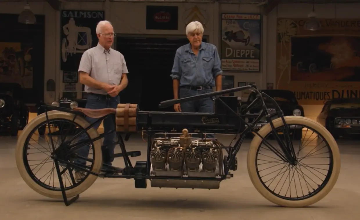 Il cuore del progetto era un V8 da 4 litri derivato da applicazioni aeronautiche e accreditato di circa 40 CV. Considerato che la maggior parte delle “moto” dell’epoca si affidava a monocilindrici di piccola cilindrata, il confronto era semplicemente impari. Una moto, la Curtiss, che secondo le ricostruzioni storiche fu in grado nel 1907 di superare i 210 km/h. Oggi conservata come reperto museale, troppo fragile e preziosa per essere utilizzata. Un peccato! Da qui l’idea di Jay Leno’s Garage: realizzarne una replica il più fedele possibile all’originale e completamente funzionante, utile a restituire le sensazioni che il pilota della V8 provava in sella.