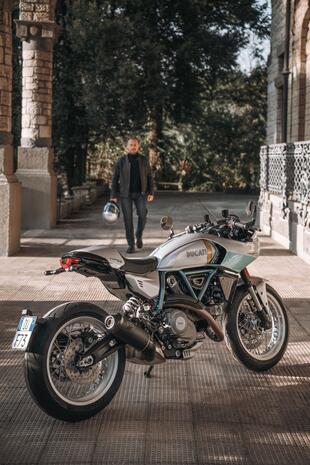 Il motore è il Desmodue bicilindrico a L da 803 cm³ con distribuzione desmodromica a due valvole, omologato Euro5+: 73 CV a 8.250 giri e 65,2 Nm a 7.000 giri. La scelta di questo propulsore, fedele nella filosofia costruttiva a quello che rese celebre la 750, non è casuale: il raffreddamento ad aria, il sound del Termignoni sviluppato ad hoc e le forme del motore a vista fanno parte integrante dell'estetica della moto tanto quanto le carene. Il telaio a traliccio in acciaio, verniciato in verde acqua, non si nasconde ma diventa elemento decorativo. Le ruote a raggi da 17 pollici calzano Pirelli Diablo Rosso IV.