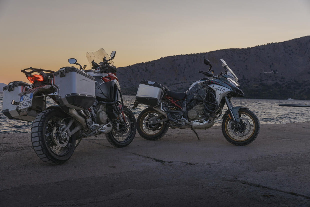 Pensata per affrontare anche lunghi tragitti in coppia, la Multistrada V4 Rally è dotata di parabrezza maggiorato, pedane ottimizzate, manopole riscaldate regolabili su cinque livelli e cruscotto TFT da 6,5 pollici con navigazione integrata. Il nuovo cavalletto centrale facilita il sollevamento della moto, mentre la sella, disponibile in varie altezze, assicura adattabilità alle esigenze di ogni utente. La dotazione si completa con ruote a raggi tubeless, freno posteriore maggiorato da 280 mm e tre allestimenti: Radar, Adventure Travel & Radar (con valigie in alluminio e selle riscaldate) e Full Adventure (con silenziatore Akrapovic e parafango in fibra di carbonio). Le livree disponibili sono Ducati Red/Brushed Aluminium e Jade Green/Brushed Aluminium, entrambe con serbatoio in alluminio spazzolato a vista.