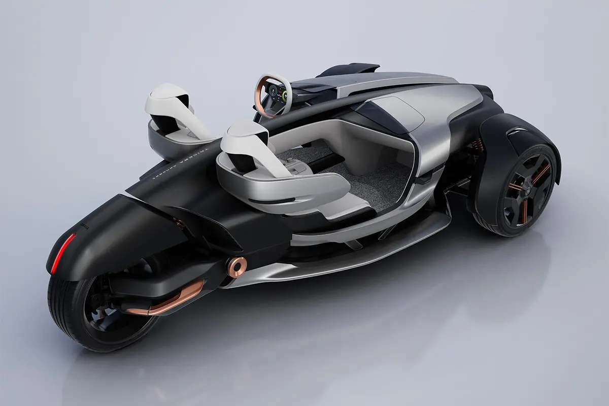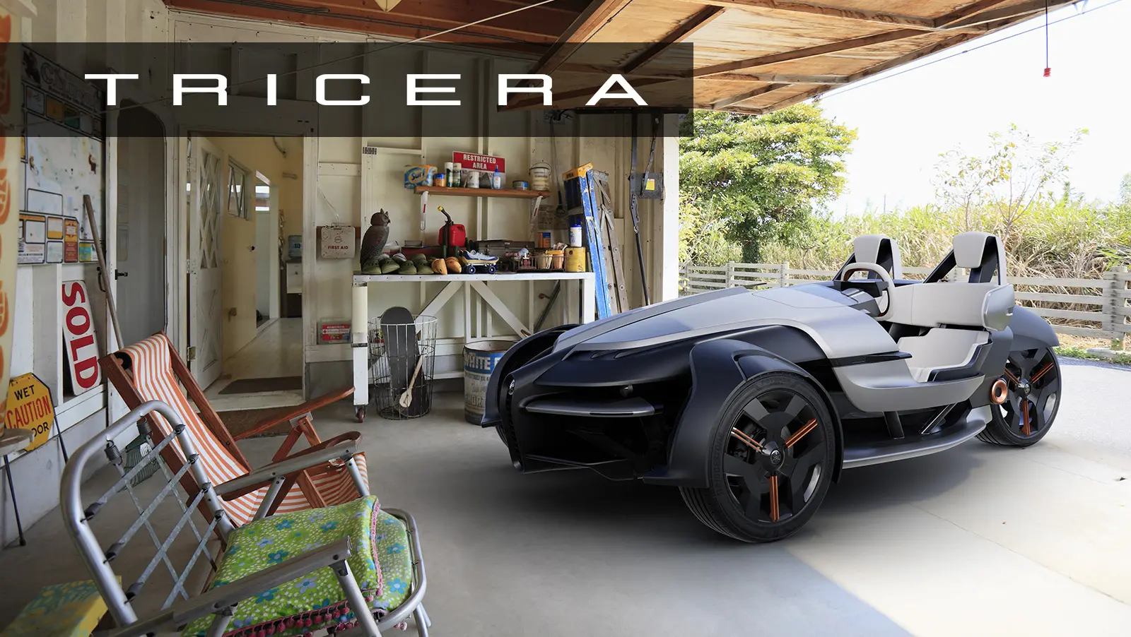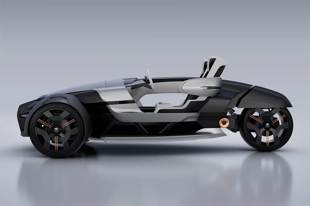 Una autovettura a tre ruote sterzanti a tetto scoperto. Linea sportiva e appagante, ha il suo appeal nel feeling dovuto al livello di controllabilità percepito quando si cambia il punto centrale del raggio di sterzata tramite la fase e la controfase della ruota posteriore.