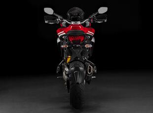 La versione Pikes Peak della Multistrada prevede una livrea dedicata e cerchi neri con filetto rosso. La base tecnica è quella raffinata della Multistrada S, arricchita ulteriormente da un lungo elenco di parti speciali in carbonio e sospensioni rigorosamente Öhlins