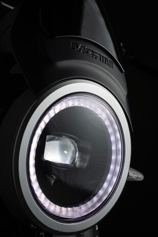 La Moto Morini Super Scrambler sfoggia linea elegantemente retrò, manubrio alto, ruote da 17 pollici e il classico bicilindrico a V che in questa versione eroga 116 CV a 8.000 giri. Raffinata la componentistica, tutta made in Italy