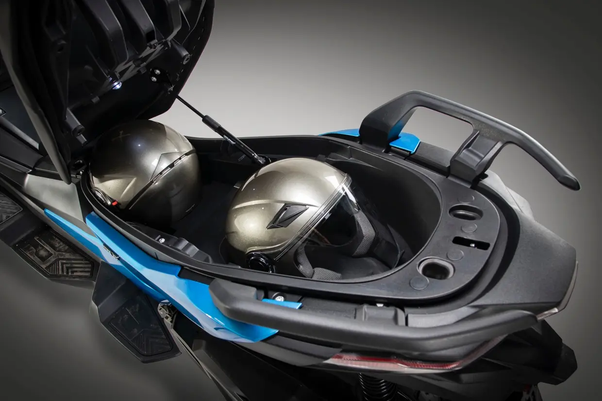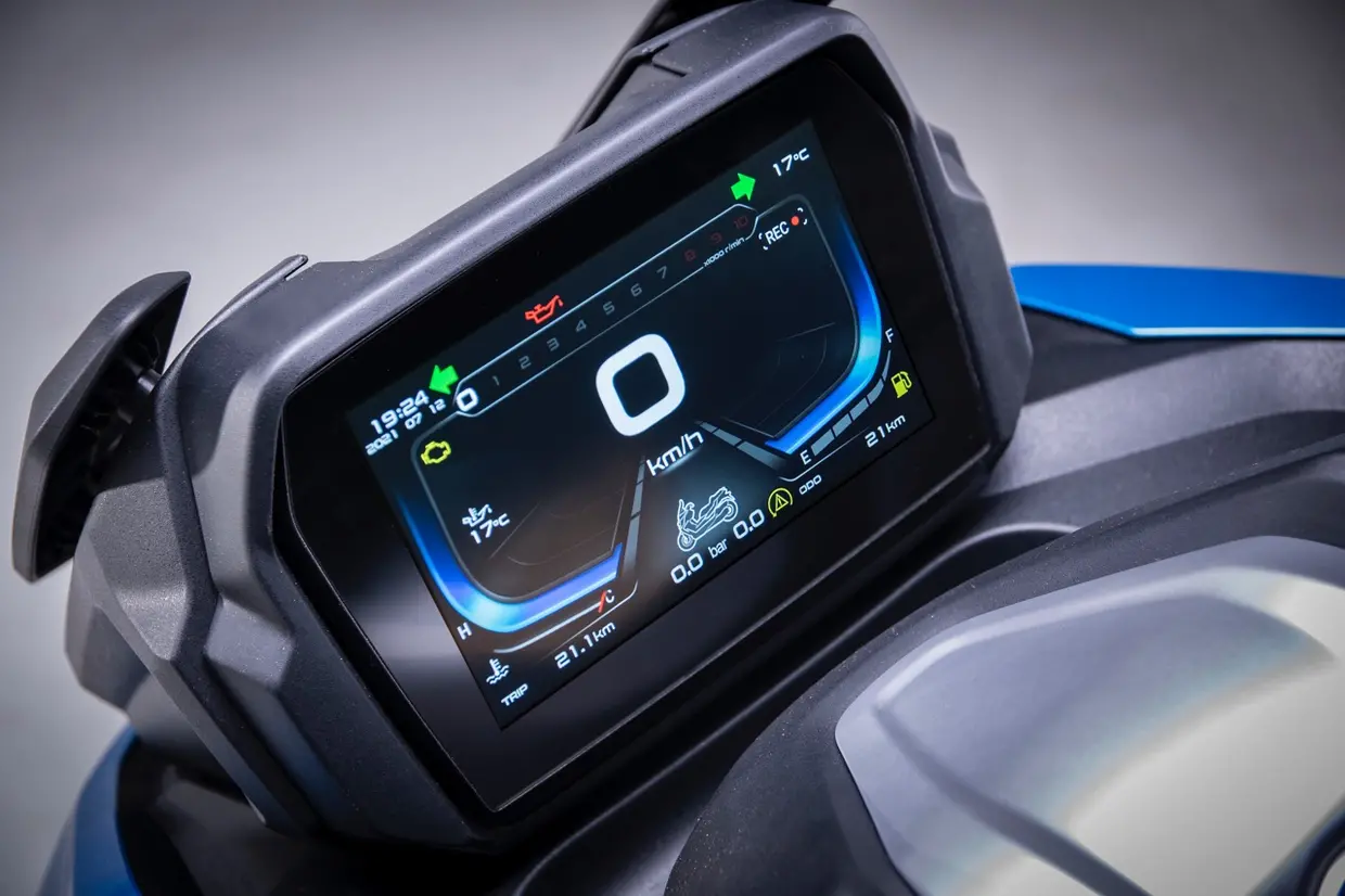 La ricca dotazione di sicurezza comprende controllo di trazione TCS, ABS a due canali realizzato da Continental, segnale di arresto di emergenza (che fa lampeggiare le luci posteriori in caso di frenata brusca) e il monitoraggio della pressione degli pneumatici in tempo reale, un feedback tempestivo che permette di viaggiare senza preoccupazioni. L’avviamento si comanda tramite chiave/telecomando keyless; quest’ultimo è dotato di bike finder con un raggio d’azione di 50 metri. Il sistema di antifurto integrato permette l’accensione dello scooter solo quando riconosce il chip contenuto nella chiave. C’è inoltre una videocamera integrata nello scudo, che può ospitare una scheda di memoria Micro SD o TF per memorizzare foto e video con un semplice click dal comando posizionato sul manubrio.