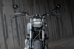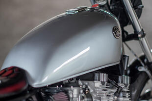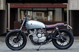 La XJ650 conserva il suo motore quattro cilindri da 653 cm³ con trasmissione a cardano e doppio albero a camme, ma cambia volto grazie a numerose modifiche artigianali. Il serbatoio originale lascia il posto a un elemento proveniente da una Kawasaki KZ, fissato con staffe personalizzate e verniciato con una tinta ripresa dalla Yamaha FJR1300. I loghi Yamaha originali completano il tocco classico. Il posteriore è stato completamente riprogettato: il telaietto è realizzato a mano e sostiene una sella sottile rivestita in pelle rossa, l’unico elemento commissionato all’esterno. Al posto del parafango tradizionale, una coda in alluminio ospita il fanale posteriore, la targa e gli indicatori a LED. Il comparto elettrico è stato ricostruito ex novo, con una centralina Motogadget e cablaggi nascosti nel telaio e nel manubrio. L’avviamento è gestito da un sistema RFID, sempre Motogadget, e la strumentazione combina elementi analogici e digitali. Completano l’allestimento comandi Motone, specchi e pulsanti integrati, oltre a un faro anteriore Koso montato su staffe custom.