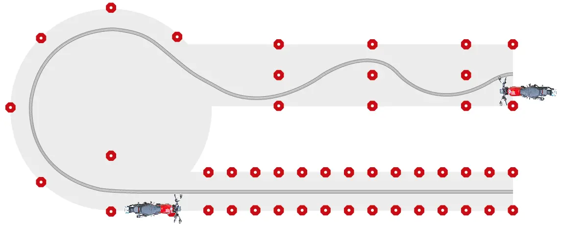 Si inizia con lo slalom, lasciando sulla destra il primo cono posto alla distanza di 2,2 metri dalla partenza. Terminato lo slalom, bisogna effettuare a bassa velocità e senza incertezze una curva che porta nel corridoio stretto. Si viene bocciati se: si tocca o si salta un cono, si esce dal percorso, si mette un piede a terra, si guida in modo irregolare e si completa il percorso in un tempo inferiore ai 15 secondi.