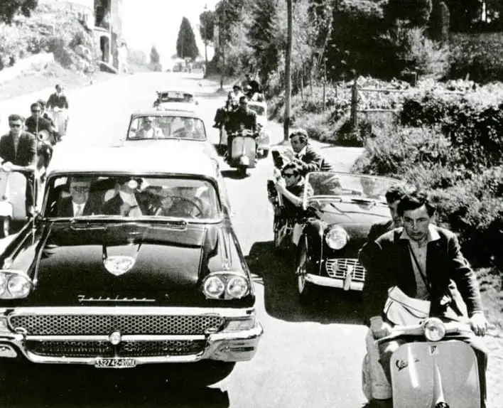 Indimenticabile ne La strada il motocarro Guzzi Ercole che accompagna lo scalcagnato Zampanò attraverso un’Italia povera e itinerante, fatta di piazze, strade secondarie, paesi di passaggio. Sempre in sella ad un motocarro, questa volta un Innocenti FD 125 C del 1952, il cliente di Cabiria, che va la notte a trovare la sua amata. Poi, certamente più famosa, arriva la Vespa de La dolce vita: agile, veloce, e libera nel traffico romano, perfetta per i fastidiosi paparazzi (non confondetela con quella portata da Gregory Peck in Vacanze Romane di William Wyler!).
