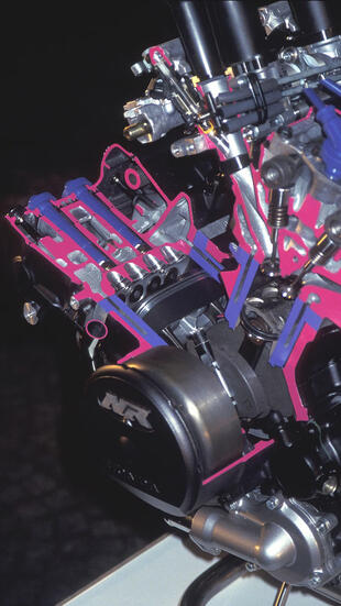 Uno spaccato del motore a pistoni ovali della Honda NR 750, in evidenza pistone e camera di scoppio a 8 valvole