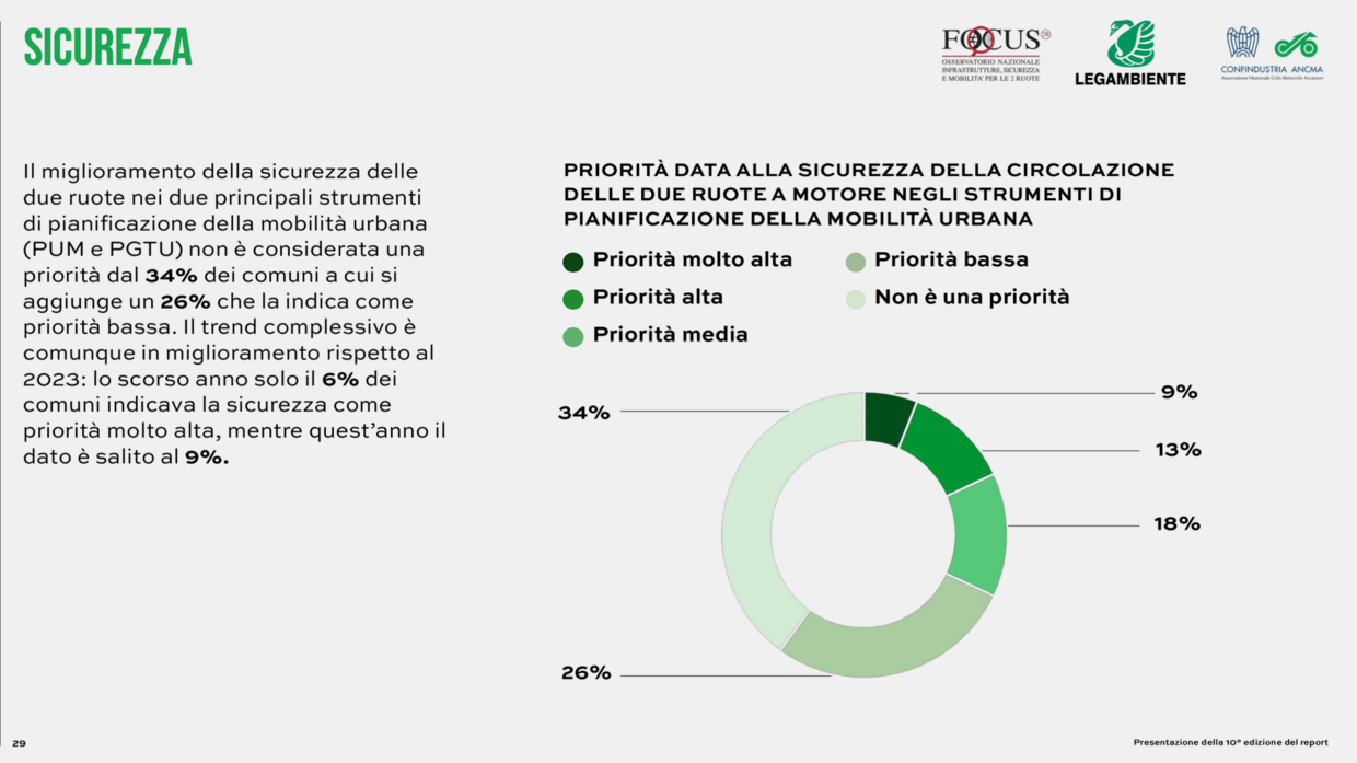 Critica anche la sicurezza: oltre il 58,6% dei comuni non considera questo tema una priorità, nonostante un aumento del 10% della mortalità tra occupanti di due ruote a motore. A proposito di sicurezza, nel 2024 il numero complessivo di incidenti stradali è aumentato, mentre il numero di vittime è diminuito, con riduzione del tasso di mortalità. Nonostante ciò, utenti di biciclette e motocicli rappresentano ancora una quota significativa di feriti e decessi. Solo il 60,6% dei comuni considera la sicurezza ciclabile una priorità alta o molto alta, mentre per le due ruote a motore oltre il 58% delle amministrazioni assegna una priorità bassa o nulla. Le Zone 30 continuano a crescere: 76 capoluoghi hanno introdotto limiti di velocità a 30 km/h o inferiori, con prime evidenze di riduzione degli incidenti.