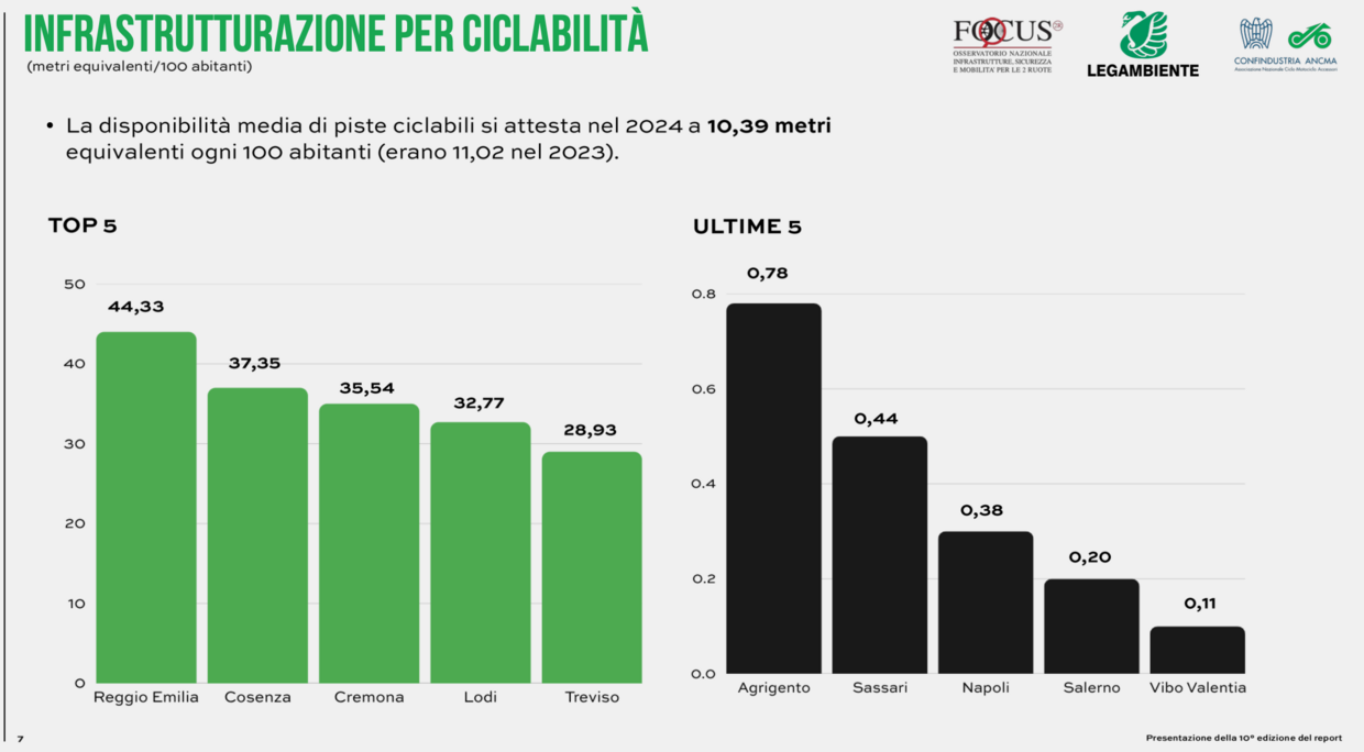 Sul fronte infrastrutturale, la disponibilità media di percorsi ciclabili nei capoluoghi si attesta a 10,39 metri equivalenti ogni 100 abitanti, considerando piste in sede propria, corsie riservate, percorsi promiscui bici/pedoni e zone a moderazione della velocità. Un dato leggermente in calo rispetto al 2023, ma comunque in crescita del +44,9% rispetto al 2015. Reggio Emilia, Cosenza e Cremona guidano la classifica, mentre permangono forti divari territoriali, soprattutto nel Mezzogiorno. Positivi invece i segnali sull’intermodalità: il 63,7% dei comuni consente il trasporto delle biciclette sui mezzi pubblici, e oltre l’80% delle città ha attivato parcheggi bici presso almeno una stazione ferroviaria.