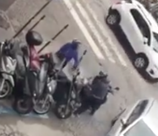 Ecco come due ladri di scooter, dopo essere riusciti ad avere la meglio su un bloccadisco, riescono a portarsi via uno Yamaha Tmax. Bastano due colpi bene assestati per liberare il mezzo e andarsene sotto gli sguardi indifferenti della gente