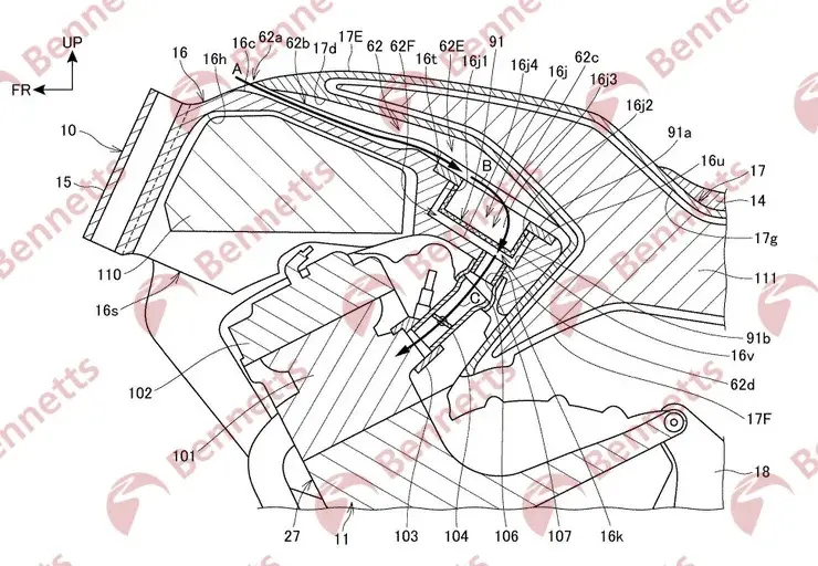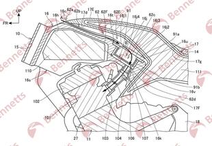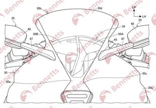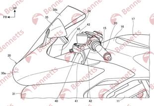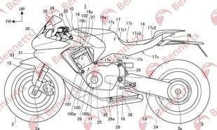 I brevetti appena depositai dalla casa giapponese, ci mostrano un motore a quattro cilindri in linea - molto probabilmente un’unità derivata da quella montata sulla CBR1000RR-R Fireblade - abbinato a un telaio particolarmente innovativo e leggero. Più nel dettaglio, notiamo tre sezioni principali: la prima, nella parte anteriore, presenta una sezione in lega pressofusa a forma di "n" che fissa la testa dello sterzo alla parte superiore del motore andando, così a creare uno spazio interno sufficientemente ampio per contenere batteria ed elettronica. Al posteriore troviamo invece un profilato di rinforzo in alluminio avvitato direttamente al carter del cambio, con il motore a fungere da elemento portante.