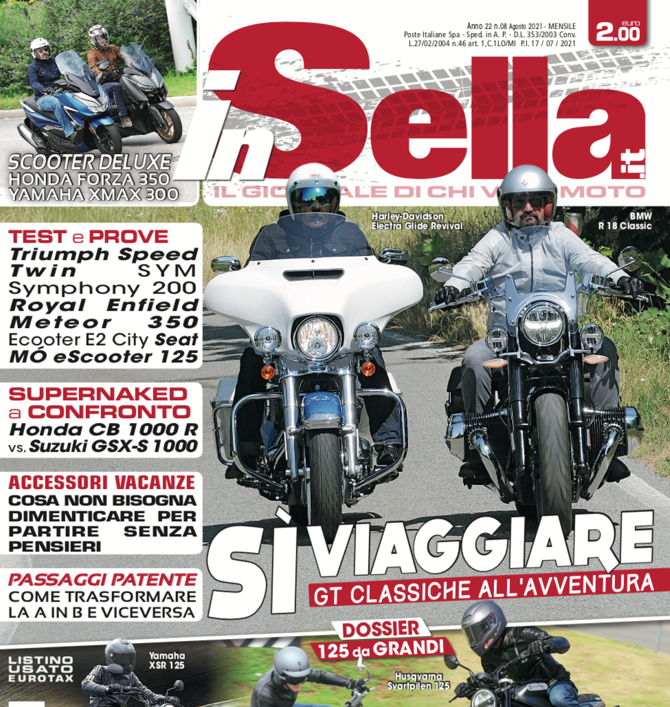 Cosa c’è di meglio che accompagnare qualche giornata di meritato riposo, magari sotto l’ombrellone, con delle buone letture? Questo mese vi offriamo un menu interessante per aiutarvi a passare il tempo delle vacanze sognando (o scegliendo) la vostra prossima moto. Sul numero di agosto di inSella, arrivato in edicola in questi giorni, troverete tanta carne al fuoco. Test in anteprima con quelli delle nuove Triumph Speed Twin e Royal Enfield Meteor 350, oppure degli scooter elettrici Seat Mò ed Ecooter E2, e anche l’ultima versione dell'intramontabile SYM Symphony che monta ora un nuovo motore 200. Altrettanto ricco il capitolo confronti: a sfidarsi questo mese due GT Classiche come l’Harley-Davidson Electra Glide Revival e la BMW R 18 Classic e due supernaked da usare tutti i giorni, come la Honda CB 1000 R e la Suzuki GSX-S 1000 che per il 2021 si presentano con parecchie novità. Chi deve usare invece lo scooter tutto l’anno troverà interessante il confronto tra il nuovo Forza 350 e lo Yamaha Xmax 300 Euro 5, ma se invece siete tra quelli stufi dei “soliti” scooter, ecco per voi un bel dossier sulle moto 125 retrò, da guidare con la patente B a qualsiasi età. Infine con la guida acquisti di questo mese vi proponiamo tutti gli accessori da avere a bordo per partire senza pensieri. Allora cosa aspettate? Ci vediamo in edicola!