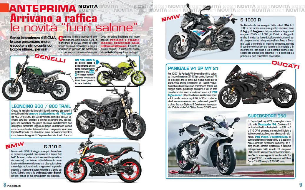 Si comincia con le anteprime della novità che vedremo dai concessionari nei prossimi mesi, e anche con i primi test su strada dei modelli 2021: Ducati Multistrada V4 S, Triumph Trident 660 e Honda X-ADV. Abbiamo anche tre grandi confronti, la Crossover 850 BMW F 850 GS, KTM 890 Adventure e Moto Guzzi V85 TT, le classiche in edizione limitata Moto Guzzi V7 III Stone S e Royal Enfield Continental GT LE e un dossier con tutti i tre ruote di media cilindrata: Yamaha Tricity 300, Peugeot Metropolis 40, Piaggio MP3 350 e Qooder QV3. Da non perdere la guida acquisti con i capi tecnici riscaldati elettricamente e lo sport con l'analisi della vittoria in MotoGP di Suzuki e un servizio dedicato alla Dakar che anche quest’anno prenderà il via a gennaio in Arabia Saudita. Insomma il consiglio è sempre lo stesso: andate in edicola, inSella vi aspetta!