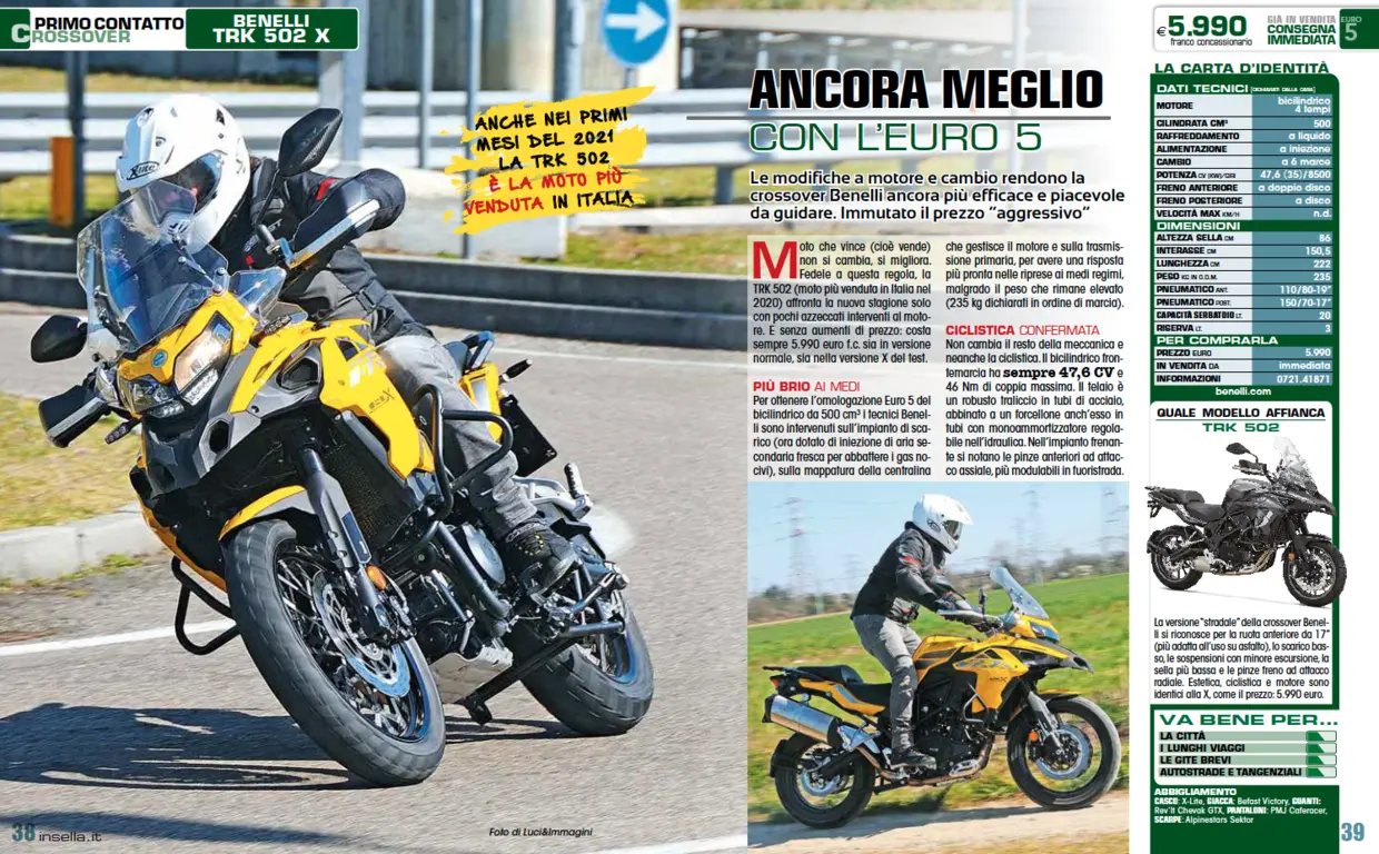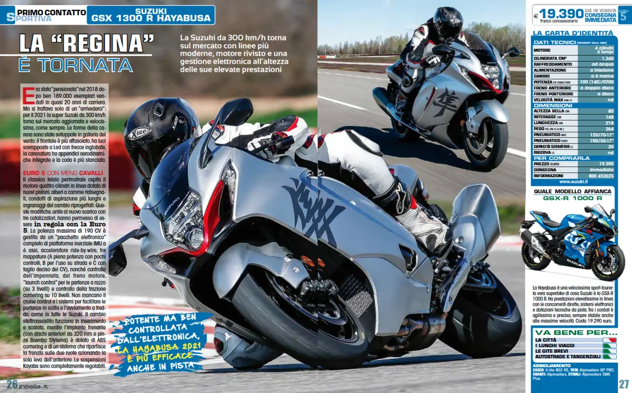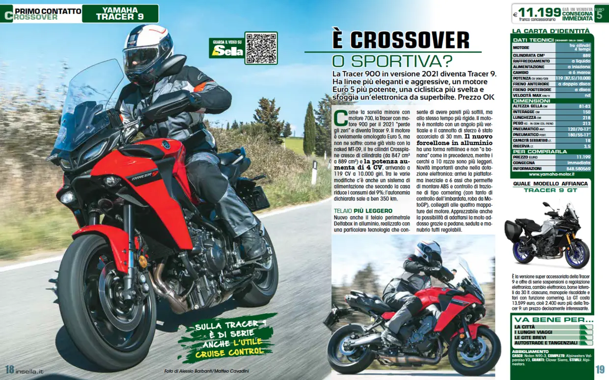 Poi ci sono 12 test “primo contatto” per tutte le esigenze e le tasche: dal piccolo Yamaha D’elight 125 alle grandi, potenti e costose Suzuki Hayabusa e BMW R 1250 RT. Tra questi estremi c’è di tutto: la nuova Ducati Monster, le crossover Yamaha Tracer 9 e Triumph Tiger 850 Sport, la piccola moto elettrica da città Voge ER10 e la versione 2021 della Benelli TRK 502 X, la moto più venduta in Italia. Senza dimenticare lo scooter Piaggio Beverly 400 (pag.50) e il piccolo Nito Nes 10 elettrico (pag.58) e l’attesissima Honda NC 750 X DCT , una delle moto più razionali e allo stesso tempo divertente che ci siano in circolazione. Insomma il piatto è ricco non mancate dal vostro edicolante!