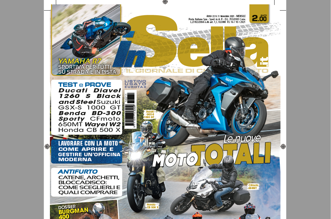 Nella copertina di questo mese parliamo di moto totali, sono le moto utilizzabili ogni giorno in tutte le stagioni per andare a lavorare durante la settimana e nel tempo libero èer divertirsi e rilassarsi. Insomma come le crossover protagoniste del nostro “confrontone” (qui sotto il video): BMW R 1250 GS, Ducati Multistrada V4 S, Harley-Davidson Pan America 1250 S e KTM 1290 Super Adventure S sono le “moto totali” più desiderate, comode e potenti per affrontare qualsiasi cosa, richiestissime da nuove e anche da usate. Una moto totale, ma di tipo diverso, è anche la nuova Suzuki GSX-S 1000 GT, una sportiva carenata ma comoda, snella, dotata di borse e sistemi elettronici di sicurezza di serie per essere usata come uno scooter... molto veloce! Meno costose, ma altrettanto “totali” sono la Honda CB 500 X e la CFmoto 650 MT e lo è senza dubbio anche il Burgman 400 a cui abbiamo dedicato un ricco dossier: arrivato nel 1998, è stato il primo “scooter totale”, buono un po’ per tutto con il suo motore 400 (prima si arrivava al massimo a 250 cm3), la sellona comoda per due, il vano sottosella grande quasi come un bagagliaio di un’auto. Questo e tanto altro sul numero di inSella di novembre che trovate in tutte le edicole, vi aspettiamo!