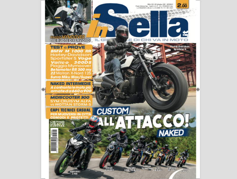 Il menu che vi abbiamo preparato su inSella di settembre è da pranzo di ferragosto. Si comincia con il maxiconfronto tra le naked intermedie, abbiamo spremuto Aprilia Tuono 660, BMW F 900 R, Ducati Monster, Kawasaki Z 900, KTM 890 Duke, Triumph Street Triple e Yamaha MT-09SP su un percorso tra pianura e montagna di oltre 600 km: un test variegato e impegnativo per aiutarvi a scegliere quella giusta per voi. Per i test in anteprima abbiamo la SBK BVMW M 1000 RR, la nuovissima Harley-Davidson Sportster S, la Voge Valico 300DS, il Sunra Miku elettrico, il tre ruote da lavoro Piaggio MyMoover, la piccola Motron X-Nord e la Betamotor 300 RR 2T da enduro. La guida acquisti è dedicata ai capi che sembrano “casual” mentre sono dei veri indumenti tecnici da moto, mentre per il turismo vi facciamo conoscere alcuni dei percorsi più spettacolari da fare in Sardegna (settembre è il mese migliore per godersela fino in fondo). Da non perdere l’approfondimento dedicato ai “mestieri” nati nel paddock della MotoGP e il Green Planet dedicato alle bici pieghevoli da usare in città portandole (anche) sui mezzi pubblici. Insomma, come sempre l’appuntamento è in edicola: non mancate!