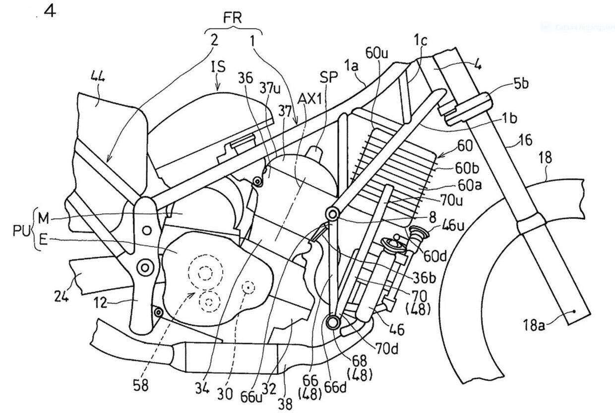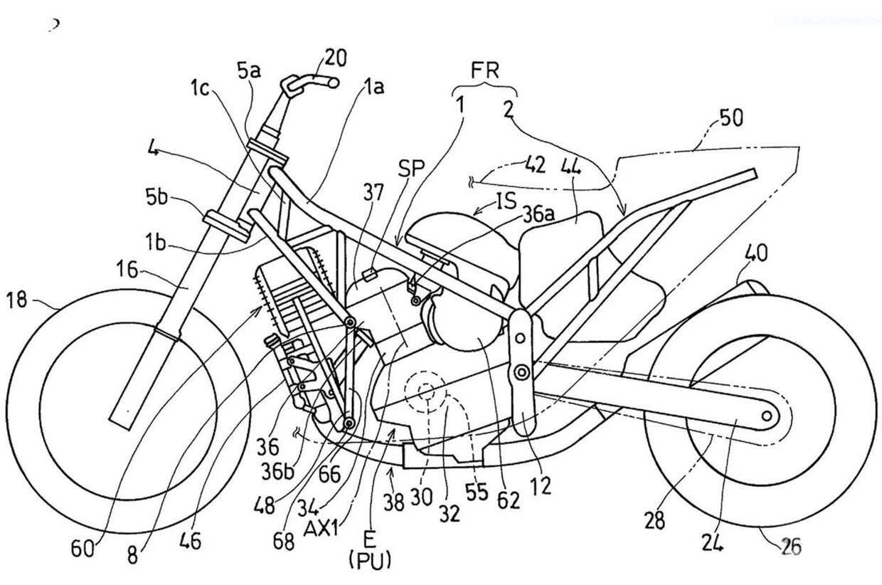 Nel caso del maxiscooter, il brevetto spiega come alcune componenti debbano essere riposizionate per adattare le sovrastrutture tipiche di uno scooter. Nello specifico i tecnici giapponesi hanno rivisto la disposizione di elementi chiave come batteria, serbatoio e sistema di raffreddamento. Il motore resta in una posizione simile a quella delle moto ibride, mentre il serbatoio del carburante viene spostato sotto la sella e assume una forma ad arco, studiata per ottimizzare lo spazio disponibile. La batteria, invece, viene collocata anteriormente, su un supporto trasversale davanti alla testata del motore. Questo comporta anche il riposizionamento del radiatore, spostato più in basso, e l’estensione del telaio verso l’anteriore, con un conseguente avanzamento della ruota anteriore. La soluzione mira a mantenere equilibrio e funzionalità, lasciando spazio anche ad eventuali vani portaoggetti.