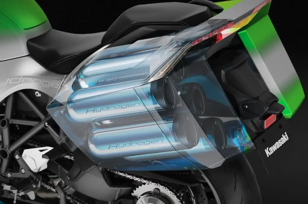 Proprio l'anno scorso, Kawasaki ha svelato alcune immagini della sua moto a idrogeno che spiegano anche dove verrebbe stoccato il carburante necessario per muoversi, Ci sono infatti cinque bombole cilindriche stivate in ognuna delle valigie laterali della moto. Si tratta di una soluzione necessaria per il nuovo tipo di carburante, perché la massa dell'idrogeno è molto più leggera (circa un decimo) di quella della benzina. Tradotto, per ottenere la stessa quantità di energia della benzina stivata in un normale serbatoio, serve un volume molto più grande di idrogeno. In molti hanno notato che il modello di stoccaggio in cilindri sembra essere simile a quello ideato da Toyota per i suoi primi prototipi a idrogeno: un sistema di bombole intercambiabili per alimentare veicoli e addirittura generare elettricità casalinga. Non si tratta ovviamente di un "furto", perché Kawasaki, assieme a Yamaha, Toyota e Subaru e Mazda si sono unite in un "cartello" per lo sviluppo di motori a combustione alimentati a idrogeno.