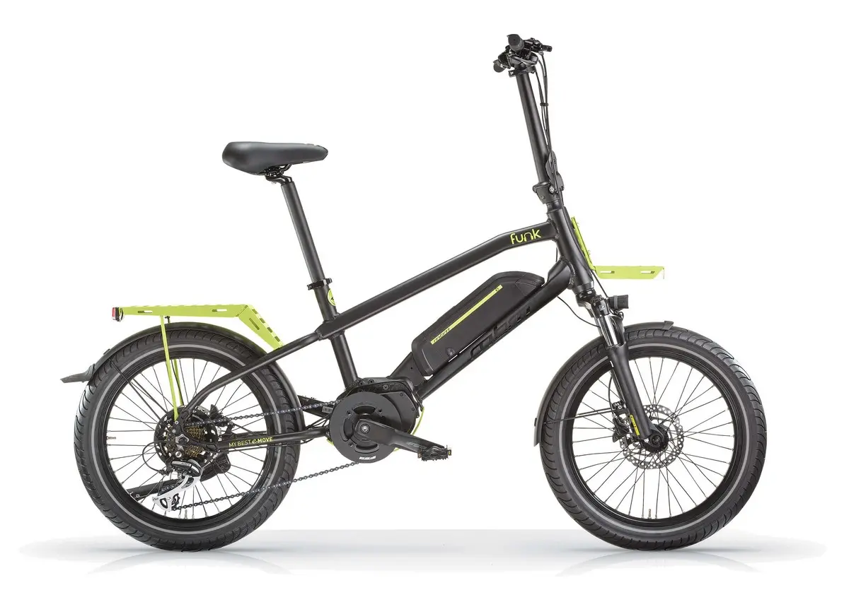 Più cara (1.774 euro) la Funk, una compatta con ruote da 20” pensata per pedalate più divertenti senza rinunciare alla comodità del trasporto sui mezzi pubblici, sempre possibile grazie agli ingombri minimi, al manubrio pieghevole e al peso non eccessivo (26 kg). Il telaio è in alluminio idroformato con doppio tubo orizzontale per una maggiore rigidità e il motore è inserito nel movimento centrale. Si tratta dell’unità made in Italy Oli Move One, capace di erogare una coppia di 50 Nm e di fornire assistenza alla pedalata in base ai cinque livelli disponibili, selezionabili tramite tasti sul display Lcd. Ad alimentare il motore ci sono le batterie da 418 Wh fissate sul tubo orizzontale per conferire al ciclo una distribuzione ottimale dei pesi. Rispetto alla e-Metrò, si distingue per la presenza della forcella ammortizzata Suntour XCT, per l’impianto frenante idraulico Shimano MT 200 con dischi da 160 mm, il portapacchi anteriore e le ruote più larghe (3”). Di maggiore pregio sono pure l’impianto d’illuminazione con luci Spanninga 40 Lux e il cambio Shimano Acera, sempre a 7 rapporti. È disponibile soltanto con tinta nera e portapacchi gialli.