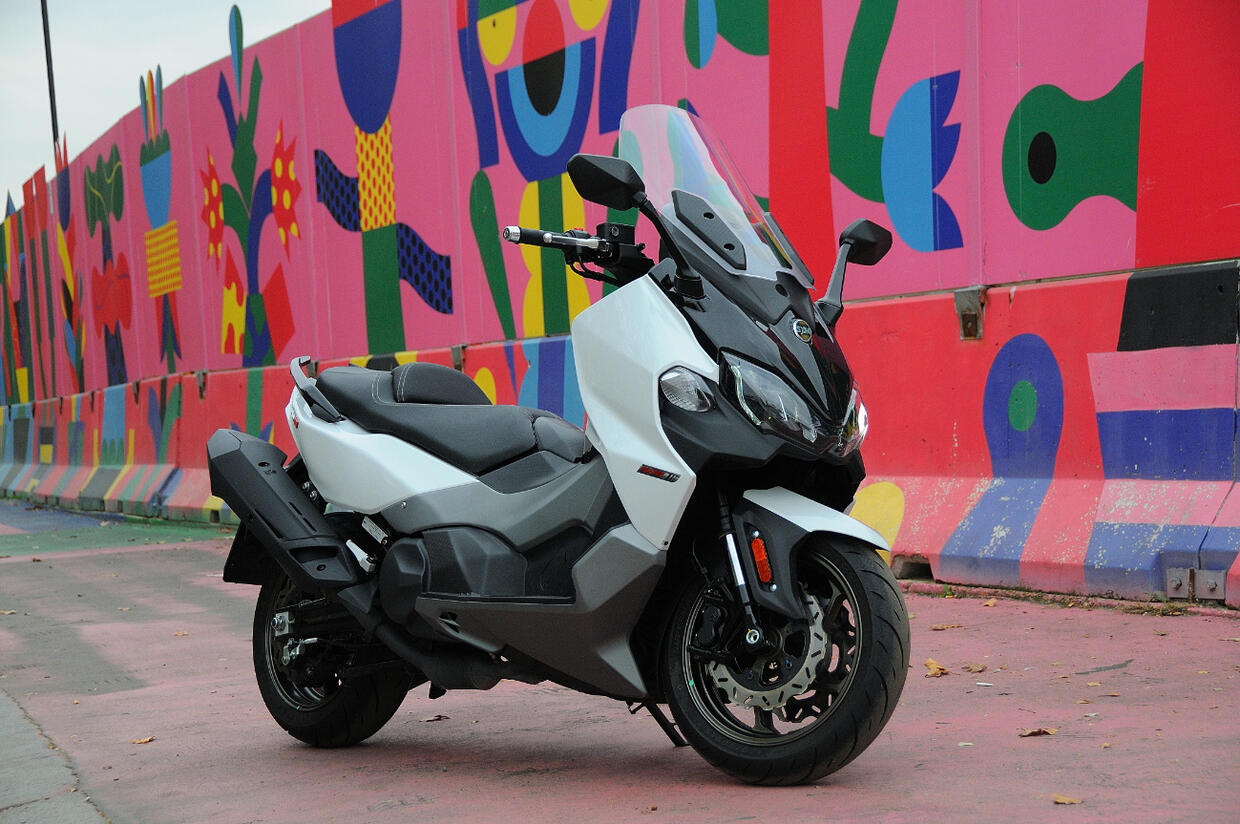 Il Maxym TL ha un potente motore bicilindrico, telaio a traliccio in tubi d’acciaio, forcella a steli rovesciati da 41 mm e monoammortizzatore (regolabile nel precarico) collegato a un forcellone in alluminio tramite leveraggi progressivi. Anche l’impianto frenante è sportivo: tre dischi con profilo a margherita e pinze radiali a 4 pistoncini. Nel sottosella ci stanno un casco integrale o due jet, nel retroscudo ci sono due portaoggetti di cui uno con presa USB. L’elettronica prevede controllo di trazione e accensione keyless. La posizione di guida è abbastanza comoda, ma lo spazio sulla pedana è ridotto al minimo: non si possono spostare i piedi, mentre se si appoggiano sul retroscudo escono dalla sagoma e sono quindi esposti all’aria.