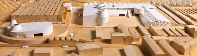 Nel plastico in bianco si vedono i nuovi edifici, quello più a sinistra è il museo