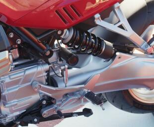 La nuova Guzzi colpisce anche per la cura con cui sono realizzati molti elementi, dai supporti delle pedane allo splendido braccio oscillante unico della sospensione posteriore, che racchiude l’albero della trasmissione cardanica. Si può rilevare come il telaio apparentemente sia a traliccio di tubi con il blocco motore che viene impiegato come elemento stressato, e come sia impiegata componentistica di alto livello: forcella a steli rovesciati e ammortizzatore Öhlins, impianto frenante Brembo con pinze a quattro pistoncini a fissaggio radiale.