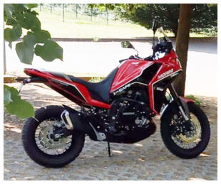 La crossover del marchio che fu bolognese e oggi ha sede a Trivolzio (PV) si distingue per la linea piacevole e originale, che si distacca dalle altre moto della stessa categoria; ma aldilà dell’estetica, spicca per caratteristiche tecniche molto interessanti. È spinta da un motore bicilindrico parallelo di media cilindrata – 650 cm³ – accreditato di 45 kW (61 CV) a 8500 giri e 56 Nm di coppia a 7000 giri, che dovrebbe consentirle di raggiungere una velocità massima di 175 km/h (ma verrà commercializzata anche una versione limitata a 48 CV per patente A2). Si tratta di un’unità inedita e modernissima, con distribuzione bialbero a quattro valvole per cilindro e misure caratteristiche superquadre, 83 x 60 mm, dotata di sistema di iniezione Bosch.