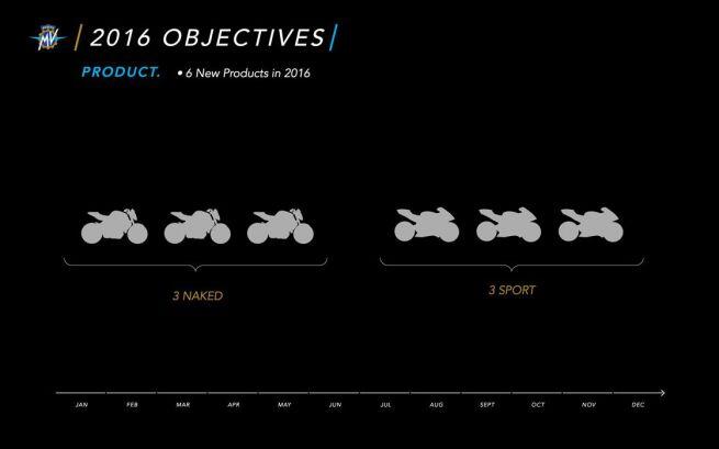 Nel corso della presentazione della nuova Brutale 800 MY2016, una slide annuncia le intenzioni della Casa varesina per i prossimi mesi: sono in programma sei nuovi modelli, tre naked e tre sportive, tra cui forse anche la nuova F4