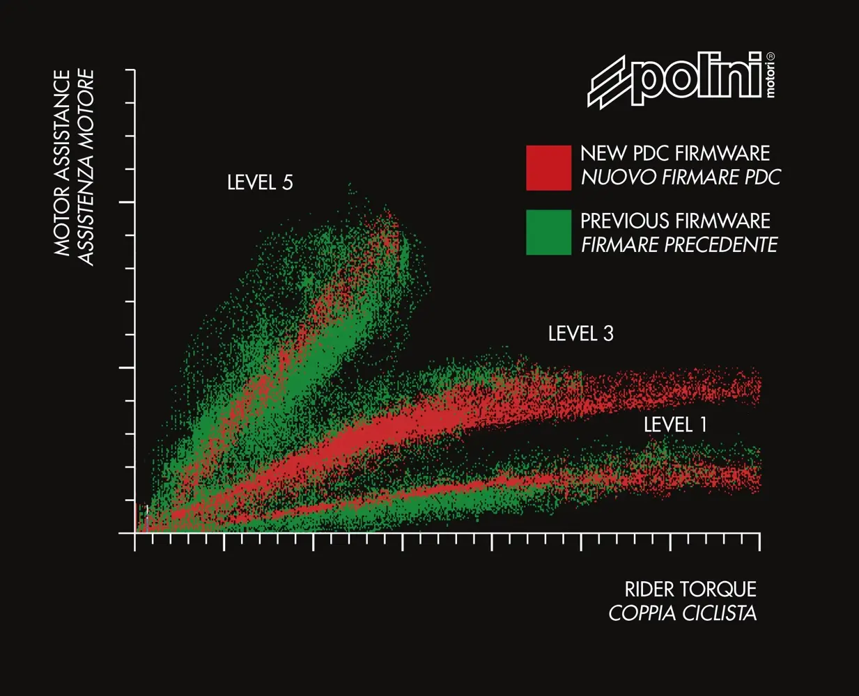 L’elettronica è totalmente nuova e sfrutta degli algoritmi di derivazione Motorsport. Il software PDC “Polini Dynamic Control” è stato sviluppato con 4 obbiettivi: precisione di erogazione della coppia di assistenza sempre in funzione dello sforzo applicato dal ciclista sui pedali; reattività nel seguire le variazioni di pedalata; riduzione del tempo di risposta da parte del motore quando si inizia a pedalare portando a zero il tempo di interruzione di spinta nel momento in cui si smette di pedalare; infine incremento dell'assistenza attiva fino a 120 RPM.